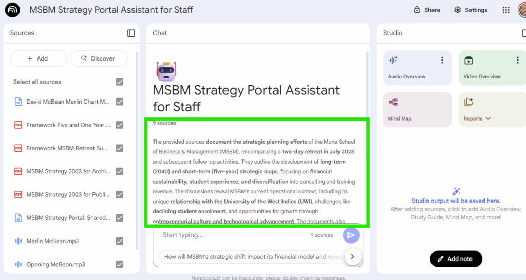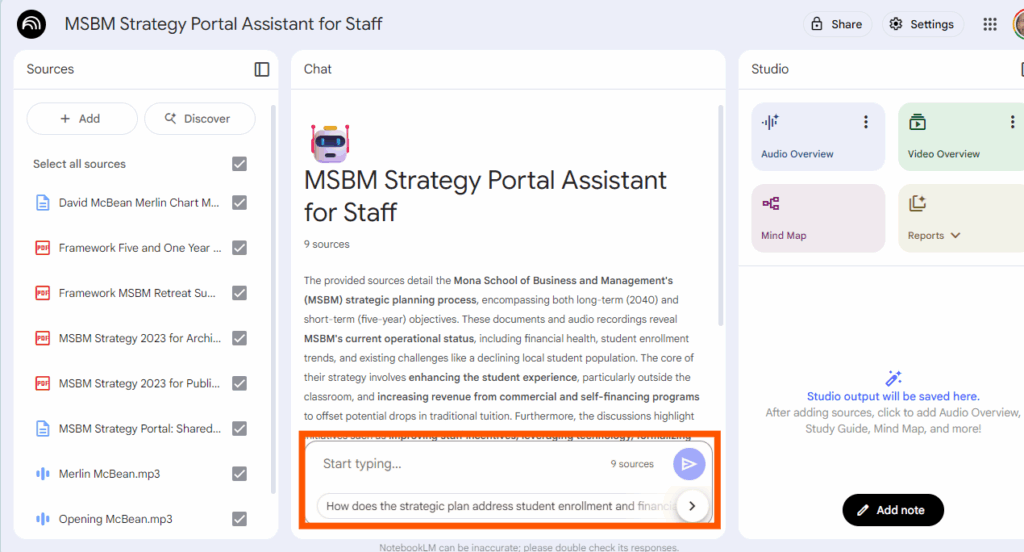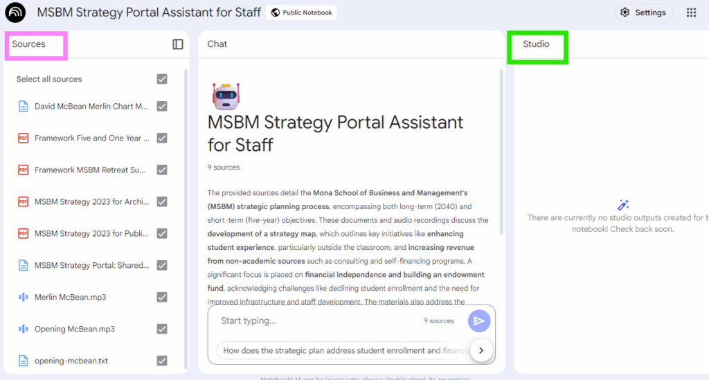Think of NotebookLM as a research assistant that has read all the documents and videos related to the strategic plan. You can have a conversation with it and ask it to find specific information, summarize documents, and even compare different parts of the strategy.